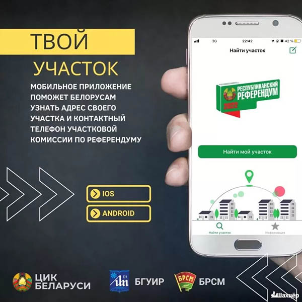 «Белорусский республиканский союз молодежи» и Белорусский государственный университет информатики и радиоэлектроники запустили мобильное приложение «Твой участок!» Благодаря этому бесплатному приложению белорусы смогут узнать адрес своего участка и контактный телефон участковой комиссии по референдуму, ознакомиться с проектом изменений и дополнений Конституции Республики Беларусь, а также с официальными новостями текущей электоральной кампании. Приложение доступно на платформе iOS, а также по ссылке: referendum.bsuir.by. В ближайшее время программа также появится на Android.