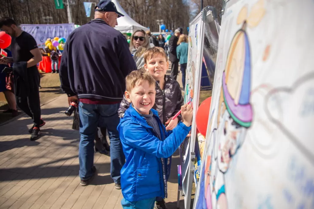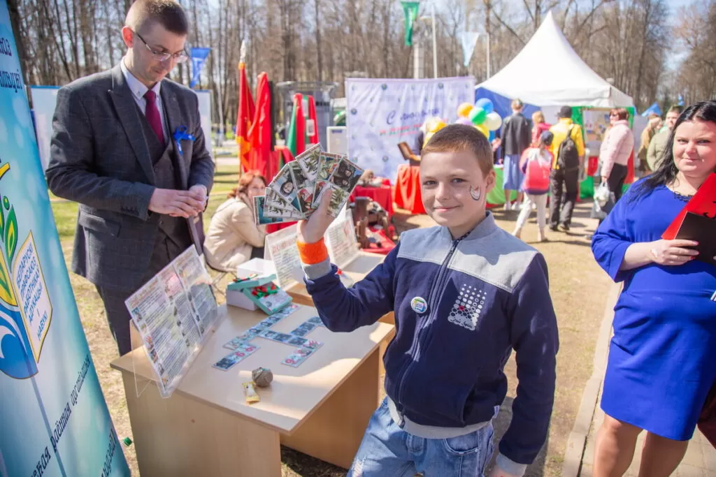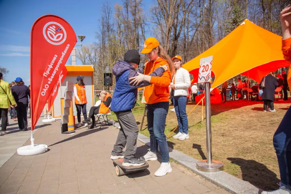Председатель профсоюзной организации ОАО «Белагропромбанк» Наталья Мармузевич пришла на праздник со своей семьей. На празднике профсоюз банковско-финансовых работников подготовил необычный квест для детей и взрослых. Так, участники фотографируются и размещают снимки в соцсетях, играют в липкий дартс, делают аквагрим, выступают в качестве серферов на балансборде и с удовольствием отвечают на вопросы викторины.