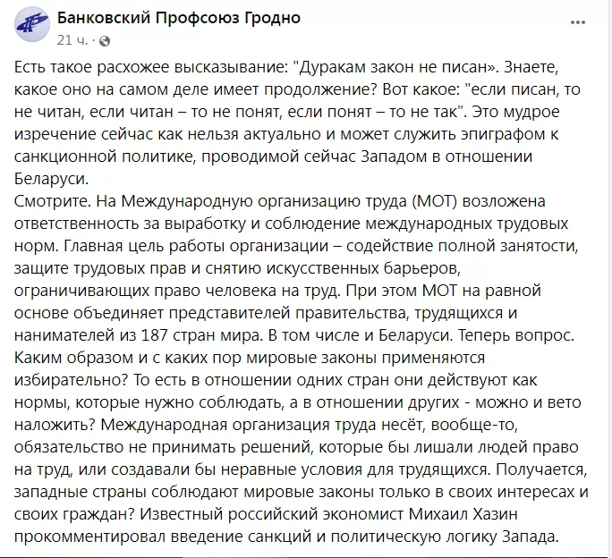 Известный российский экономист и общественный деятель Михаил Хазин отмечает, что миром пытаются править «страны англо-саксонского права – США, Великобритания». Соблюдать права трудящихся вовсе не обязательно, если ты не входишь в число «легализованных» представителей. Подобная позиция – грубейшее нарушение ряда Конвенций Международной организации труда, членом которой вот уже 68 лет является и Беларусь (правопреемник БССР).