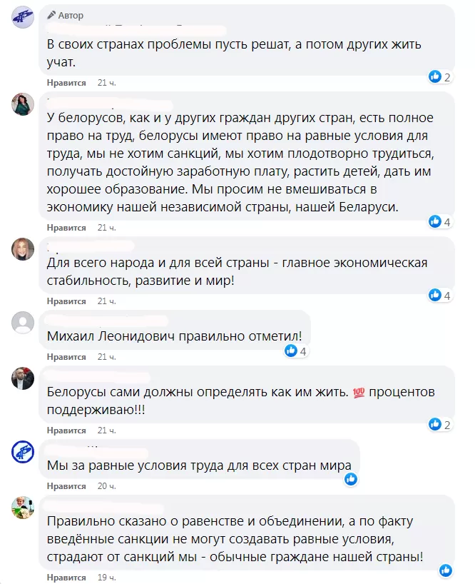 – У белорусов, как и у других граждан других стран, есть полное право на труд, белорусы имеют право на равные условия для труда, мы не хотим санкций, мы хотим плодотворно трудиться, получать достойную заработную плату, растить детей, дать им хорошее образование. Мы просим не вмешиваться в экономику нашей независимой страны, нашей Беларуси.