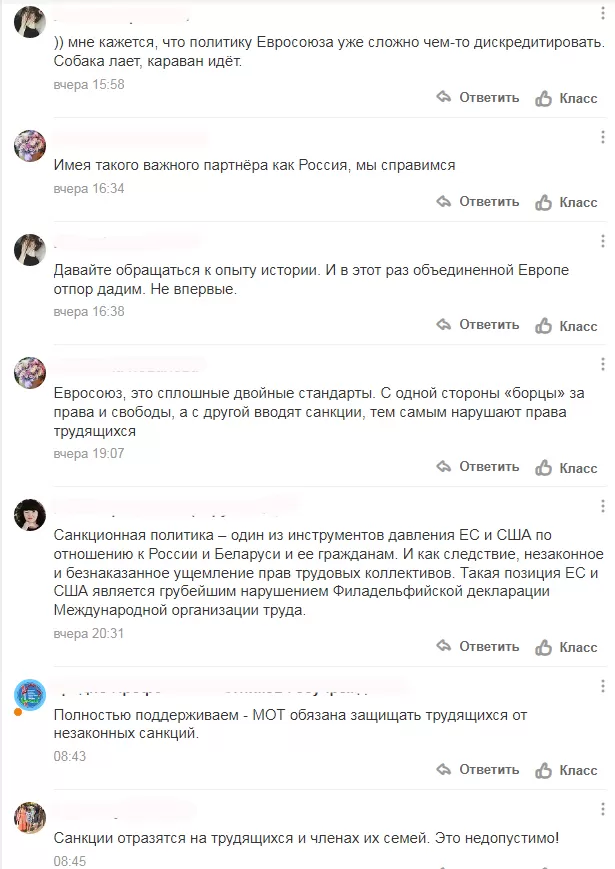 Уже всем очевидно, что санкционная политика – один из инструментов давления ЕС и США по отношению к России и Беларуси, а также ее гражданам. И как следствие, мы сегодня наблюдаем незаконное и безнаказанное ущемление прав трудовых коллективов. Такая позиция ЕС и США является грубейшим нарушением Филадельфийской декларации Международной организации труда, подчеркивают пользователи социальных медиа.