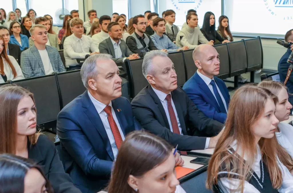 Впервые Александр Лукашенко не просто посещает определенный вуз, а обращается сразу ко всем учащимся страны. Несколько сотен молодых людей сели за парты во Дворце Независимости, а прямую трансляцию мероприятия вели все учреждения образования Беларуси. «МИТСО» – не исключение. Студенты университета вместе с почетными гостями – Главой Администрации Президента Игорем Сергеенко и председателем Федерации профсоюзов Михаилом Ордой – стали слушателями урока с символическим названием «Историческая память – дорога в будущее».