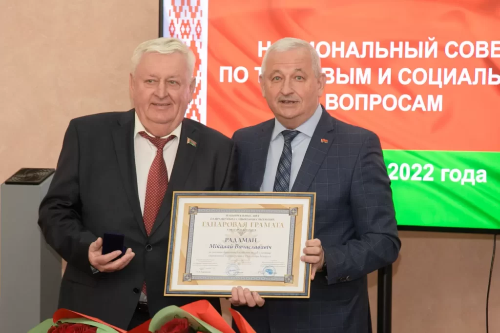 Кроме того, впервые состоялась церемония награждения учрежденной в этом году Почетной грамотой Нацсовета по трудовым и социальным вопросам. За значительные достижения и личный вклад в развитие соцпартнерства отмечены Владимир Семашко (в прошлом – первый заместитель премьер-министра, возглавлявший правительственную сторону на Нацсовете), генеральный директор ОАО «СветлогорскХимволокно» Василий Костюкевич и председатель СПК «Агрокомбинат «Снов» Несвижского района Минской области Николай Радоман.