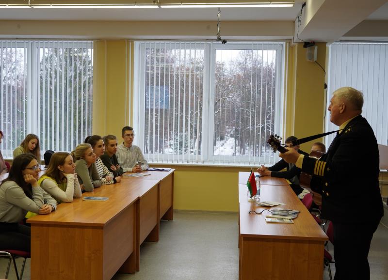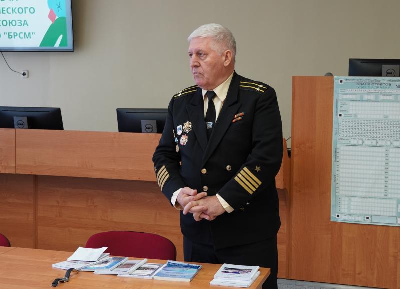 На встречу с молодежью пришел председатель Совета ветеранов военных моряков Пинска, ветеран Вооружённых Сил Военно-морского флота капитан 2 ранга, председатель Пинской городской организации Профсоюза работников госучреждений с 2002 по 2015 годы Владимир Магомедович Бисултанов.