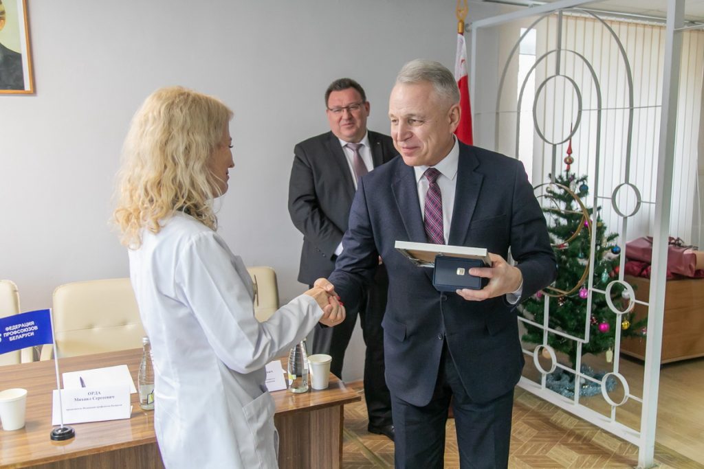 В преддверии новогодних праздников председатель Федерации профсоюзов Беларуси Михаил Орда и председатель Белорусского профсоюза работников здравоохранения Вячеслав Шило посетили Атолинскую больницу им. Н.Г. Гришука